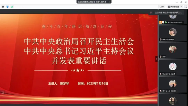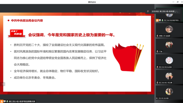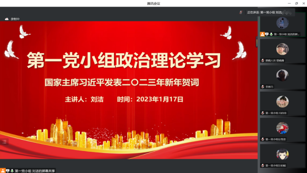 首先,第一党小组刘洁同志以“国家主席习近平发表2023年新年贺词”为切入点,就“明天的中国,希望寄予青年”这一主题内容带领大家展开政治理论学习,她讲到:2022年是党和国家历史上极为重要的一年。党的二十大胜利召开,擘画了全面建设社会主义现代化国家、以中国式现代化全面推进中华民族伟大复兴的宏伟蓝图,吹响了奋进新征程的时代号角。作为新时代党员,我们更要带着脚踏实地的韧劲和滴水石穿的毅力,埋头苦干、守正创新,不断厚植家国情怀、涵养进取品格,以奋斗姿态激扬青春,不负时代,不负韶华。