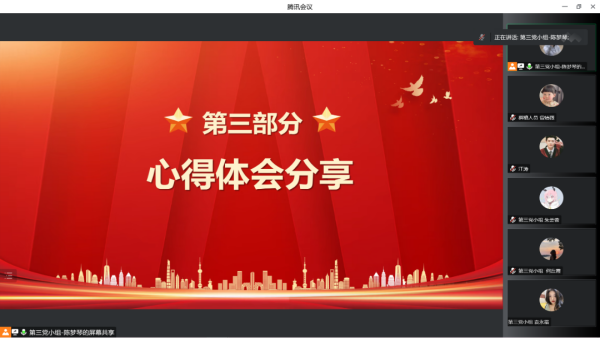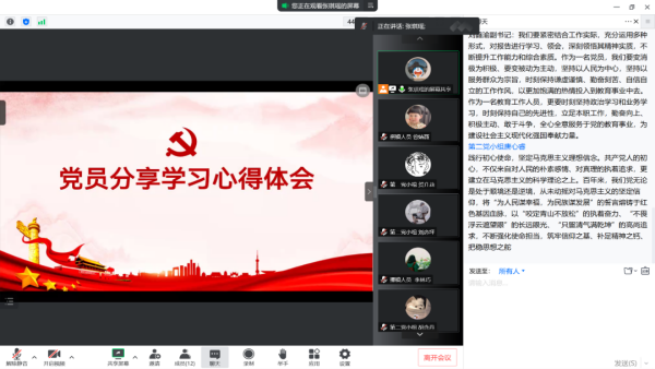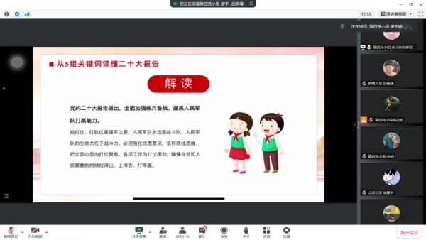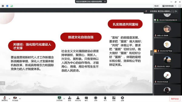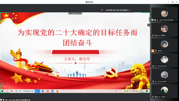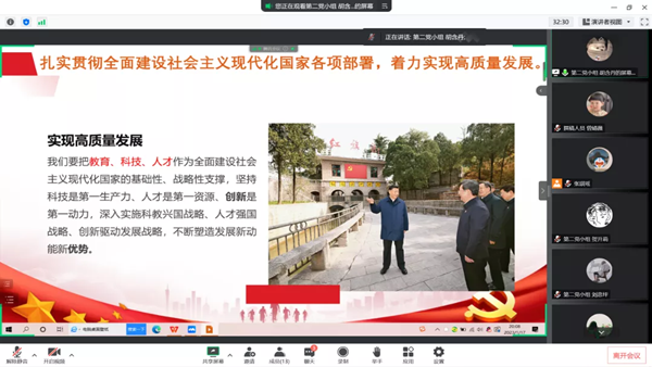 紧接着,第四党小组廖宇婷同志以“5组关键词读懂党的二十大报告”为会议主题,从扎实推进共同富裕、发展全过程人民民主、开创国防和军队现代化新局面、坚持和完善“一国两制”推进祖国统一、推动构建人类命运共同体等五方面内容出发,深入分析解读其实质内涵,不断引导党员同志深刻认识我国发展所面临的新形势、新局面。党员同志们纷纷发表意见,谈到:今后将不断深入理解全面建设社会主义现代化国家的各项部署,积极淬炼自身本领,增强斗争精神,做到埋头苦干、奋勇前进,为实现党的二十大提出的目标任务而团结奋斗。
