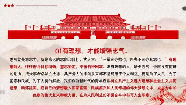 传承红色基因,争做“三有”人才。会议伊始,张弘同志通过争当民族复兴大任的时代新人、争做“三有”人才、如何培育“三有”人才三个方面带领大家共同学习。她分享到党的十八大以来,习近平总书记在很多重要讲话当中对我们青年朋友提出要求、作出期待。从要求有理想、有本领、有担当到要立大志、明大德、成大才、担大任。其实都是在要求我们青年朋友成为能够担当民族复兴大任的时代新人。她还分享到争做“三有”人才,必须增强“三气”。增强“三气”,需要我们青年朋友回答好“志气、底气、骨气究竟是什么”和思考好作为新时代青年,怎么做才能成为总书记以及党和国家以及人民期望的有志气、有骨气和有底气的时代新人。