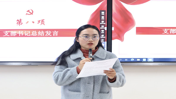 宏图展翅领党心,砥砺奋进正当时。大会在国际歌中落下帷幕,支部书记刘芳宏对本次组织生活会做总结发言。她谈到,此次大会,既是一次统一思想、提高认识的学习会,也是一次转变作风、增强党性纯洁的教育会,更是一次凝聚人心、推动支部工作持续开展的党员大会。希望各位党员在今后能够稳中求新,提质升效,细化强化党的政治建设、廉洁建设,持之以恒推进支部各项工作的开展,不断筑牢新时代基层战斗堡垒,为全面推进中华民族伟大复兴不懈奋斗。