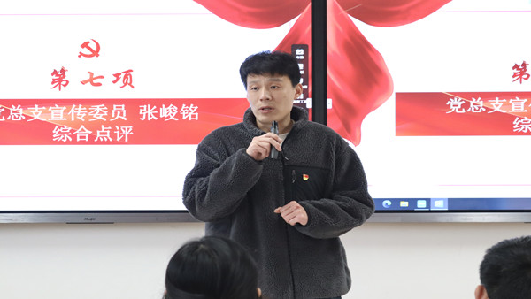 随后,党总支宣传委员张峻铭同志对本次专题组织生活会和民主评议党员大会做出点评,他提到,学生第五党支部是一个新成立的支部,将面临着许多的问题与挑战,但要有作为新生力量的冲劲儿,发展支部独有的特色,做好支部各项建设。并对全体党员同志提出三点建议:一是加强政治理论学习,做到学深悟透、学以致用,不断筑牢信仰之基,把稳思想之舵;二是希望全体党员同志以实际行动践行党员先锋模范作用,勇担时代重任,矢志奉献拼搏;三是要提升基层党组织的凝聚力和组织力,不断推动支部的各项工作迈上新的台阶。