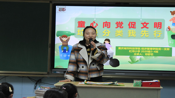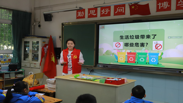 紧接着,邓舒艺同志围绕垃圾分类的内容、影响等方面展开知识宣讲。她从绿色低碳、生态文明的角度,通过垃圾分一分、歌曲唱一唱等趣味环节与小朋友们进行交流互动,推动新知新风深入日常,助力环保意识深入童心。