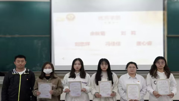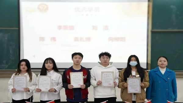 袁小琴、唐继龙和任雪羽三位老师分别为第九期入党积极分子骨干班中获得“优秀学员”的同学颁发证书。