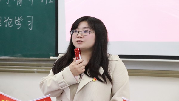 为有牺牲多壮志,敢教日月换新天。随后,邓欢欢同学带领全体学员学习了夏明翰烈士身处险境也绝不屈服的革命信念。一枚含血的唇印,一句最后的叮咛,见证了夏明翰对妻子忠贞不渝的革命爱情,也揭示出一位共产党人矢志追求真理的家国情怀,他用生命践行着“为党和人民牺牲一切”的入党誓词,用血肉彰显着共产党员的铮铮铁骨。她讲到,作为新时代青年学子,我们更要以夏明翰烈士为榜样,把夏明翰精神作为提升思想境界的重要保障和践行初心使命的不竭动力,不断继承革命先烈遗志,为实现中华民族伟大复兴的中国梦注入源源不断的青春力量。