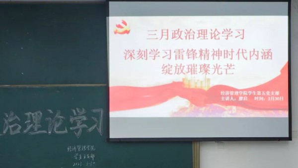 为进一步学习宣传贯彻党的二十大精神,深刻把握雷锋精神的时代内涵,充分发挥党员的先锋模范作用。3月30日中午,经济管理学院学生第五党支部以“线上+线下”相结合的方式于经管大楼401教室开展三月政治理论学习,支部书记刘芳宏及支部全体党员参加,本次活动由廖启同志主持。