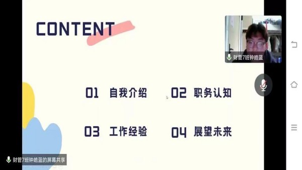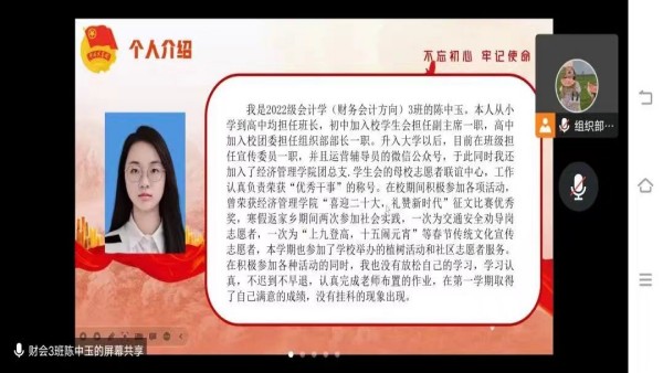 此次答辩采取线上会议的方式。各入团积极分子以PPT为依托,首先进行3分钟的个人阐述,分别围绕入团动机、个人规划、对共青团的认识和先进性表现等方面进行了汇报,汇报后进行由评委老师提问的一分钟答辩。答辩同学一致表示,自己会认真接受政治锻造、追求政治进步,积极向团组织靠拢,以成长为一名合格的共青团员为目标。