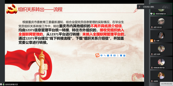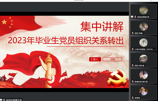 为全面推进支部党组织建设,加强党员档案规范化管理,切实做好毕业生党员党组织关系转接工作,进一步推动支部党建工作高质量发展。4月24日中午,经济管理学院学生第三党支部于腾讯会议开展了2023届毕业生党员组织关系转接集中培训工作。支部副书记胡容进行讲解,支部全体毕业生党员参加。