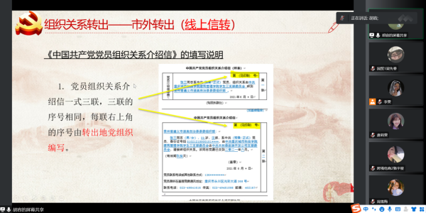 首先,胡容书记对院内转接党员和市内外转接党员的人数分别进行了摸底统计,之后她为全体毕业生党员详细讲解了党组织关系转出的流程、组织关系介绍信的填写说明以及转接过程中的注意事项,确保了每一位毕业生党员都能熟悉党组织关系转接的的具体流程。她强调,党组织关系转接是毕业生党员离校前至关重要的工作,各位党员同志们要理清转接关系的工作思路,进一步明晰党员组织关系转接的处理原则和方法,落实好党组织关系接收单位,按时依规办理好党组织关系的转接手续。