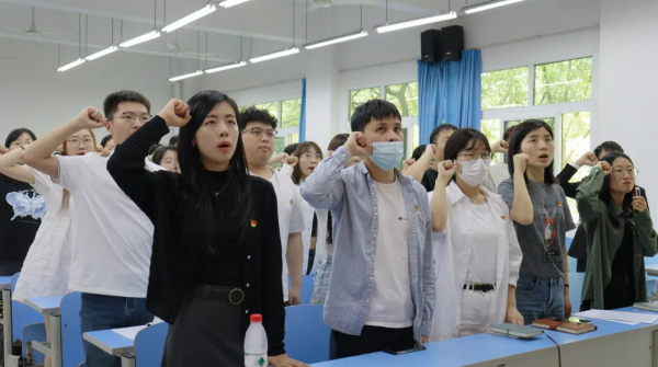 随后,在张颖副书记的带领下,全体党员面向党旗重温入党誓词,每一位同志都再次接受了心灵的洗礼,产生了强烈的共鸣,激励着毕业生党员们坚定理想信念,牢记入党誓词,做到终身坚守、终生不渝。