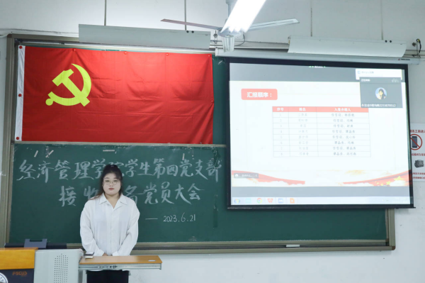 为切实提高党员发展质量,进一步加强我院党员队伍建设,继承和发扬党的光荣传统和优良作风,为党组织注入新鲜血液,保持党组织生机活力。6月21日,经济管理学院学生第四党支部采用“线上+线下”相结合的方式,于五教201教室召开支部党员大会,讨论周昀婷等8名同志发展成为中共预备党员事宜。支部书记任雪羽、副书记张纪梦、全体党员及发展对象参会,会议由王伊同志主持。