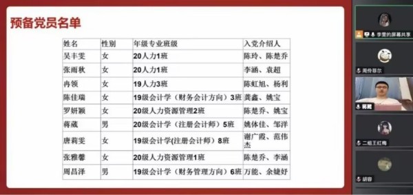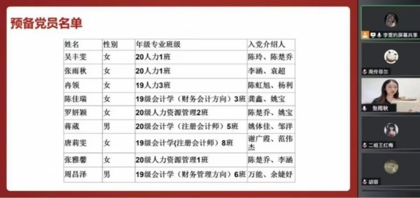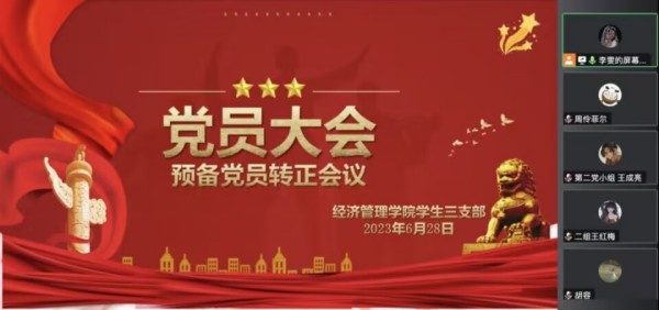为进一步加强和推进党员队伍建设,为基层党支部注入新鲜血液,凝聚符合党员条件的优秀青年学生到党的队伍和事业中,2023年6月28日,经济管理学院学生第三党支部召开预备党员转正大会,讨论关于张雅馨等9名预备党员同志转正事宜,本次会议采取线上(腾讯会议)方式进行,支部副书记胡容及全体党员参加,会议由李雯同志主持。