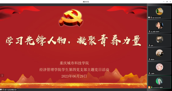 为深入学习贯彻先锋力量,淬炼党性修养,进一步加强基层党组织建设,发挥党员先锋模范作用。6月29日晚上,经济管理学院学生第四党支部于线上(腾讯会议)开展以“学习先锋人物,凝聚青春力量”为主题的党日活动,支部书记任雪羽、副书记张纪梦及支部全体党员参加,此次会议由鲁雪同志主持。