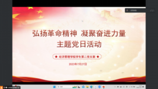 为全面深入学习党的二十大精神,进一步提高党员思想意识,加强党员思想理论武装,发扬自力更生、艰苦奋斗的精神,7月27日中午经济管理学院学生第二党支部于线上(腾讯会议)开展“弘扬革命精神,凝聚奋进力量”主题党日活动。支部书记刘鑫渝及全体党员同志参会,本次党日活动由王琳婕同志主持。
