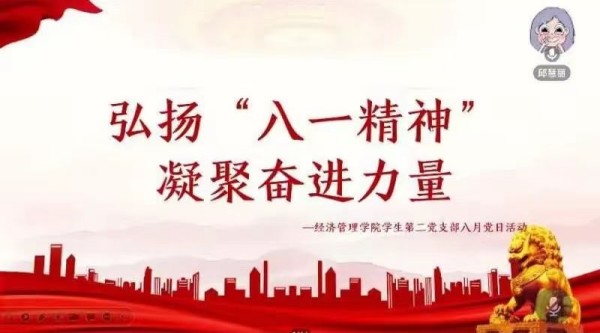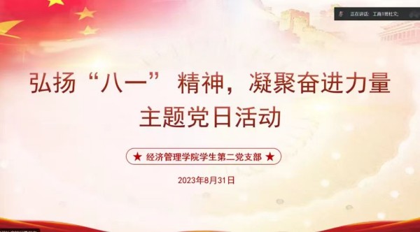 为进一步弘扬八一精神,深入学习贯彻习近平新时代中国特色社会主义思想,增强支部凝聚力、战斗力和创造力,8月31日中午,经济管理学院学生第二党支部于线上(腾讯会议)开展了“弘扬八一精神,凝聚奋进力量”主题党日活动。支部书记刘鑫渝、副书记张颖及支部全体党员参加,本次会议由杜文同志主持。