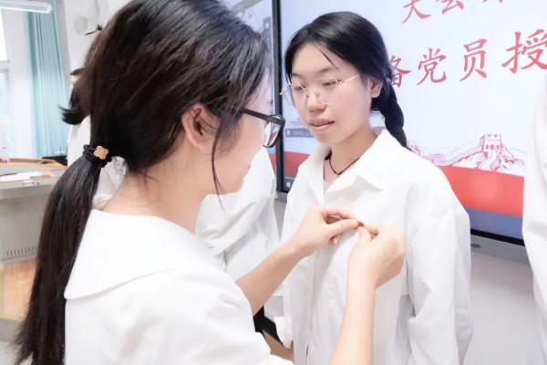 党徽闪耀映丹心,红色信念坚如磐。接着,支部书记刘芳宏和支部副书记蔡萍共同为本期发展的10名党员同志佩戴党徽。一枚党徽一生承诺,小小的党徽承载着责任和担当,闪耀着梦想和荣光。