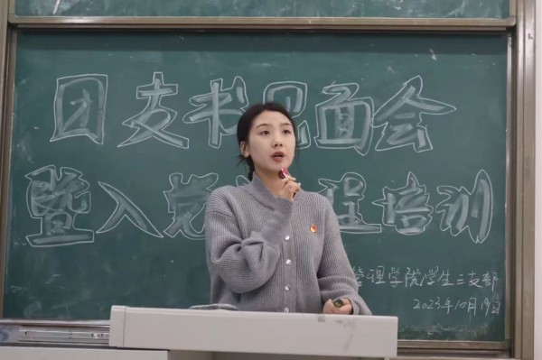 砥志研思新征程,笃行致远再出发。会议伊始,李雯同志对团支书的工作进行简单讲解,明确指出了团支书在班级发展中的重要作用,切实做好服务工作。紧接着,李雯同志向同学们详细阐述了入党流程,同时提醒大家要端正入党动机,不仅要做到在“平常时候看得出来,关键时刻站得出来,危急关头豁得出来”,更要坚定入党信仰,保持入党热情,自觉用党员的标准来严格要求自己,全方面提升自己,在积极向党组织靠拢的同时,也要打好坚实的科学文化基础。