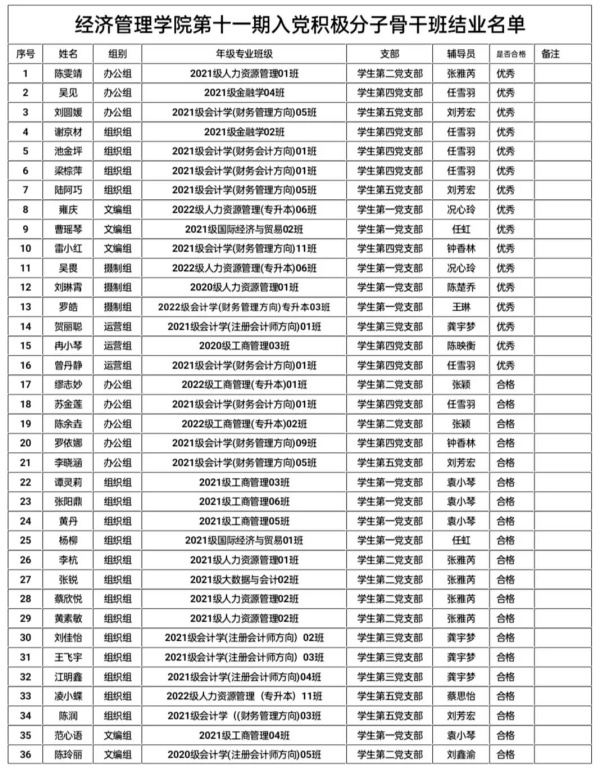 为全面贯彻落实新时代党的建设总要求和新时代党的组织路线,进一步加强入党积极分子教育管理,做好党员发展和教育工作,切实保障学院党建工作持续高效开展。根据《经济管理学院学生党员骨干班暨入党积极分子骨干班管理办法》相关规定,经济管理学院第十一期入党积极分子骨干班成员通过为期一年的学习,于11月5日完成集中培训。经过理论学习和实践活动的综合考察,缪志妙、苏金莲等34名学员考察成绩合格,予以结业;陈雯靖、吴见等17名学员表现优异,被评为"优秀学员";李冬阳、吕晋菁等18名学员成绩不合格,不予结业。