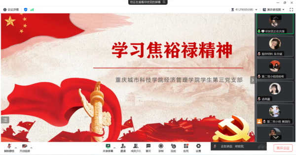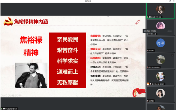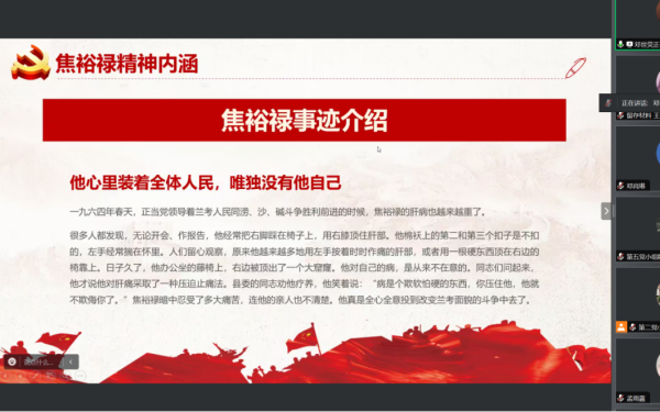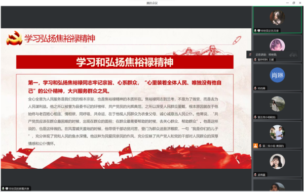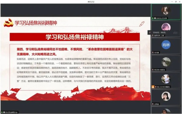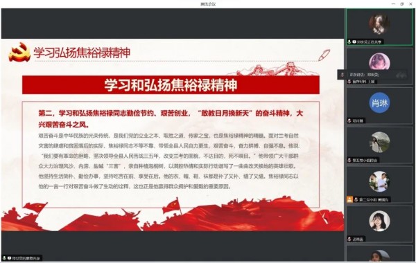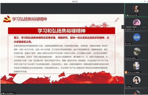 为弘扬先进典型,充分发挥先进典型示范引领作用,传承红色基因,增强党员的民族责任感和荣誉感,2024年2月21日,经济管理学院学生第三党支部于线上(腾讯会议)组织开展“学习焦裕禄精神”为主题的党日活动。支部副书记胡容及支部全体党员参加,本次会议由孟雨露同志主持,邓世荧同志领学。