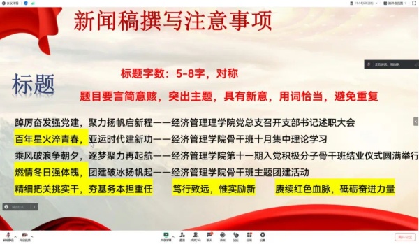 为进一步强化支部入党积极分子和骨干班成员的新闻稿写作能力,提高宣传工作效率,增强学员的主人翁意识,5月16日下午,经济管理学院学生第四、五党支部联合骨干班文编组通过“线上+线下”相结合的方式共同开展宣传培训工作。学生四、五党支部宣传小组以及第十三期骨干班文编组全体成员参会。