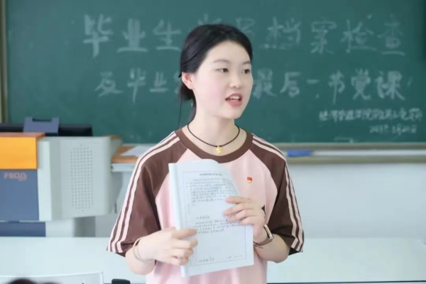 紧接着,孟雨露同志介绍了档案检查方面的相关事宜。她重点从入党申请书、转正申请书、思想汇报、入党积极分子的培养教育和考察以及党支部会议记录情况表等方面进行详细阐述,并提醒毕业生党员明确相关材料的具体书写要求,力求书写规范、无遗漏、不出错。