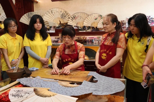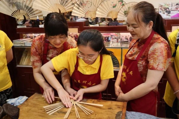 民间传统技艺的代代传承,离不开手艺人们的坚守。尹青莲告诉志愿者们荣昌折扇制作工序繁琐,背后是从取料到成扇的16道工段、145道工序,一般来说,两个月方能成一扇。随后,她向志愿者们详细演示了糊扇、折扇以及抛光打蜡等制作工序,在老师熟练的操作背后是几十年如一日的坚守,造就了岁月沉淀的手茧,仿佛经历了无数次的磨练和捶打。正是全手工的坚持,才让荣昌折扇脱颖而出。在非遗折扇传承人尹青莲的指导下,志愿者们亲自体验折扇的制作工序,近距离感受传统手工艺的魅力和精髓。