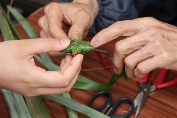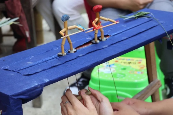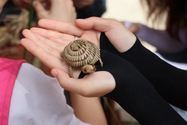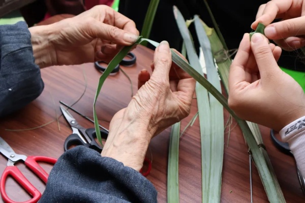 志愿者们围坐在两位爷爷身旁,开始棕编和竹编的学习之旅。余爷爷手法娴熟,一片片普通的棕榈叶在他手中上下翻飞,不一会儿就变成了一只栩栩如生的蚱蜢,志愿者们全神贯注地观察着余爷爷的每一个动作,纷纷动手尝试,从开始的生疏到逐渐掌握技巧,虽然过程中状况百出,但在余爷爷的耐心指导下,大家都完成了自己的第一件棕编作品,兴奋之情溢于言表;另一边,细长而坚韧的竹条在陆爷爷的手中灵活穿梭,竹条相互交织,纵横交错,形成了紧密而有序的纹理,陆爷爷向志愿者详细了讲解竹编要点,话语间,一把小巧精致的竹扇已成雏形。