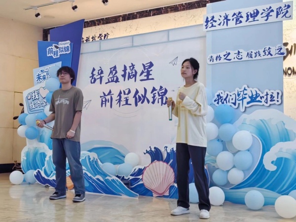 来日方长暂作别,循光而往踏歌行。又是一年毕业季,为了营造温馨欢快的毕业氛围,激发毕业生们对母校深厚的情感,增进师生情谊、培养爱校情感、深化感恩教育。6月21日中午12:30,经济管理学院“辞盈摘星,前程似锦”毕业季活动在六教大厅举行,学院党总支书记、副院长冯鑫,副院长邓丽纯,党总支副书记周德顺,团总支书记龚宇梦,毕业生辅导员以及24届毕业生代表共同见证了这一重要的时刻。本次活动由谭林召主持。