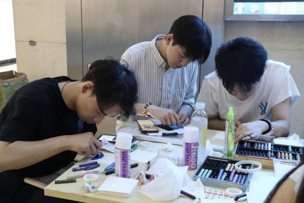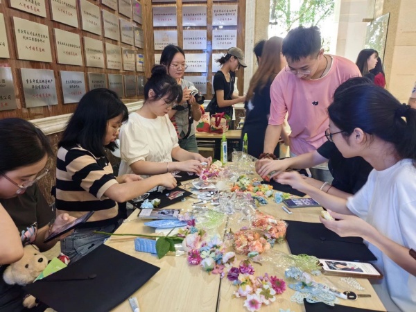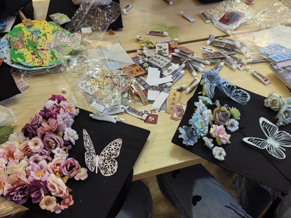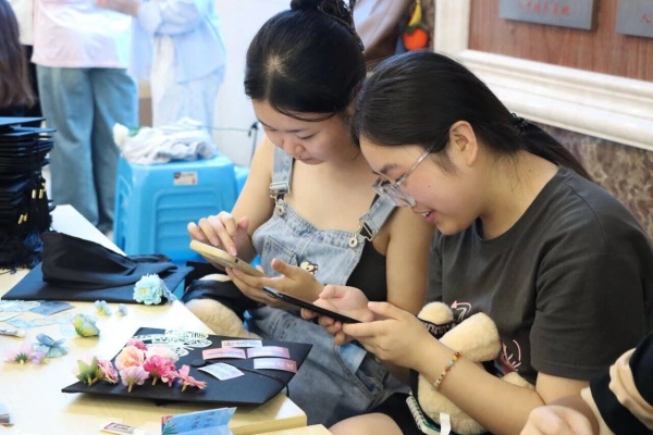 开幕式后,丰富多彩的毕业季系列活动正式拉开帷幕。首先来到手工区,毕业簪花,一路生花。当国风学士服遇上簪花学士帽,是古韵今辉的交叠,是来时路与未来途的璀璨相融;回头看,举起的画作五彩缤纷,扬起的笑容肆意张扬,自由而热烈;以漆为笔,以水为画,一半人为,一半天成,像极了独一无二的青春。