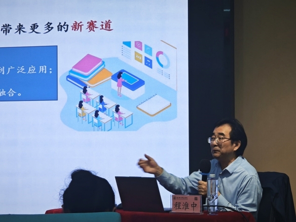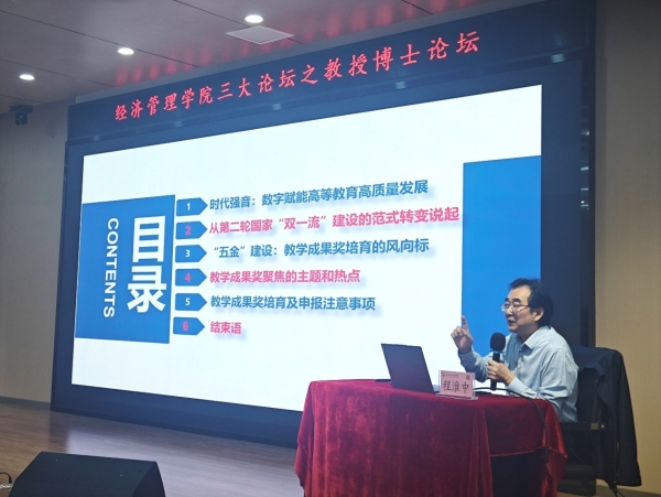 随后,程淮中教授与经济管理学院的教师们紧扣时代脉搏,围绕如何利用数字技术提升教育教学水平、促进科研创新,以及高效申报教育教学成果等议题展开了深入讨论。程淮中教授指出,数字赋能不仅改变了教育的方式方法,更对教育理念、教育模式乃至整个教育体系产生了深远影响,因此,在申报教育教学成果时,教师们应更加注重数字化技术的应用和创新,以展现自身在教育教学方面的独特见解和显著成效。同时,程淮中教授以其丰富的教育经验和独到的见解,详细讲解了申报教育教学成果的技巧和注意事项。他强调了申报材料的重要性和规范性,指出申报材料不仅要内容充实、逻辑清晰,还要注重数据的支撑和案例的呈现。同时,他还分享了自己在申报过程中的经验和心得,为教师们提供了宝贵的参考。在互动环节,教师们积极提问,与程淮中教授进行了深入的交流。大家一致认为,申报教育教学成果是一个系统而复杂的过程,需要教师们精心准备、细致打磨,以确保申报材料的质量和水平。