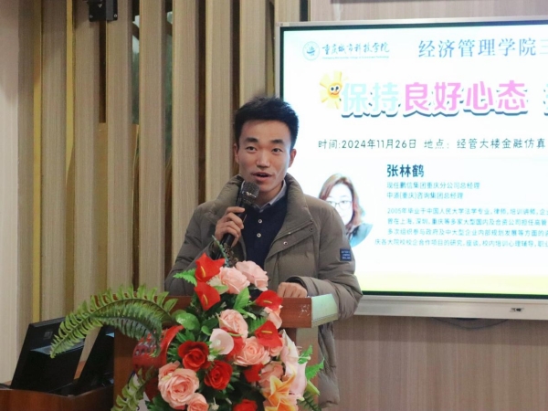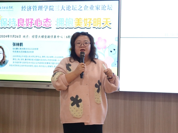 本次论坛由院长助理陶传彪主持,特邀嘉宾为中道咨询集团总经理、鹏信集团分公司总经理张林鹤。张林鹤经理带着多年的经验,为同学们呈上了主题为“保持良好心态,拥抱美好明天”的精彩分享,干货满满,金句频出。