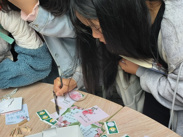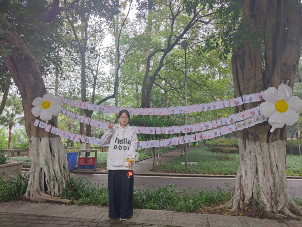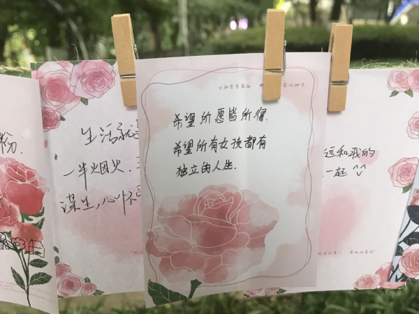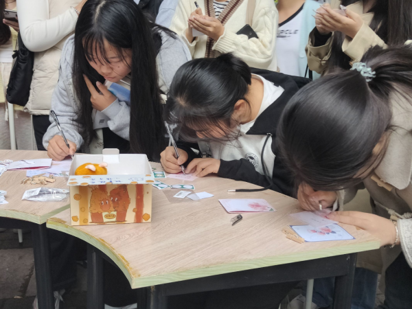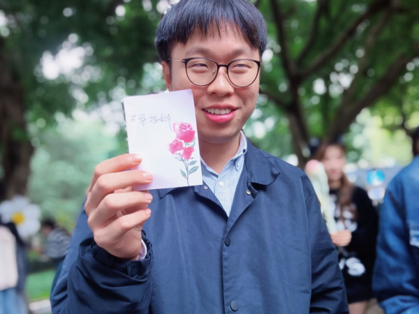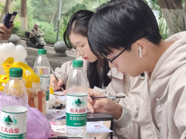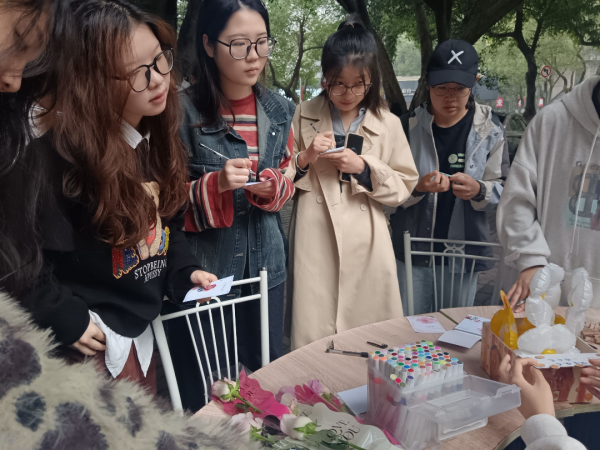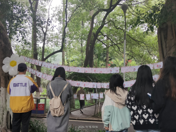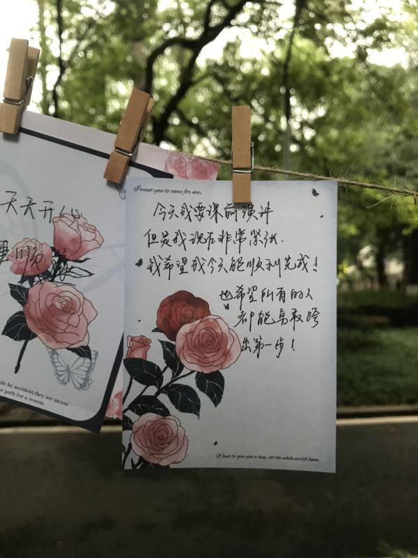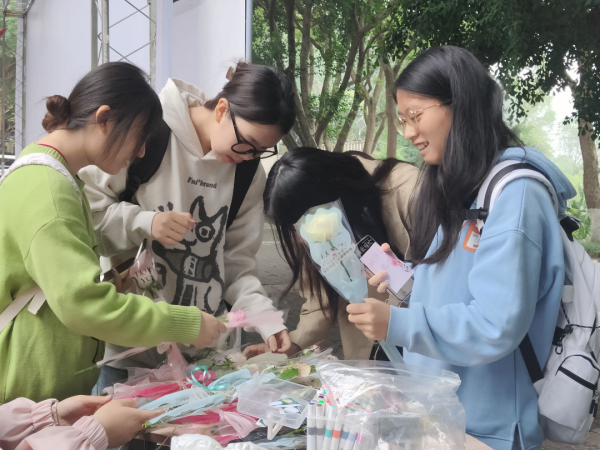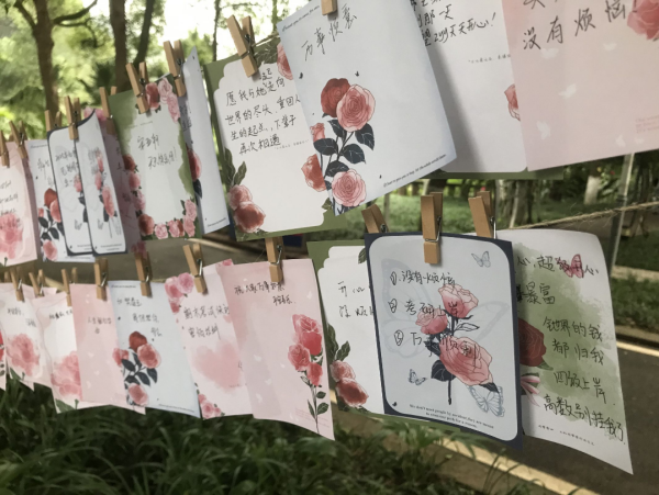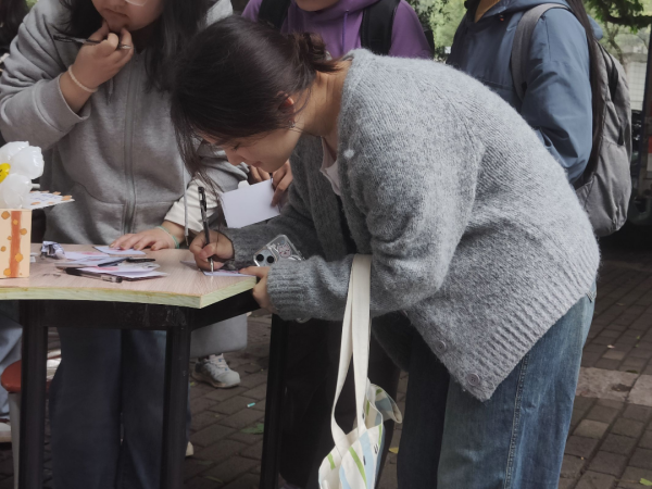 故事换花·温暖心灵。活动伊始,正赶早八的同学们都行色匆匆,脚步不停,驻足参与活动的同学并不算多,但或许是工作站的同学们热情似火的宣传,再佐以不经意间眼神交汇的碰撞,成功点燃了另一些彼时不太忙碌的同学们内心深处交流的渴望。不多时,在此起彼伏的问询声交织中了解到如果在卡片上写下一段自己想倾诉的内容并拍照分享到朋友圈即可兑换一束鲜花后,大家纷纷拿起笔,在那一张张卡片上落墨书写下诸多话语。无论是对奋斗历程、精彩时光,还是内心压抑、迷茫时刻都将被释放于纸条之上。字里行间也无不是正在透露着一个又一个同学的故事。就这样,一场关乎心与心灵相互交融的“花期”徐徐绽放。