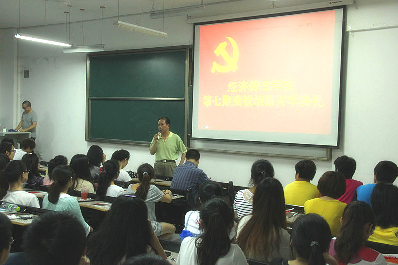 2012年5月8日晚7点30分,经济管理学院第七期党校班在主教403开课。出席开课典礼的嘉宾有:经管院党总支赵昌龙书记,经管院学生第一党支部书记杨丹老师、副书记刘娟老师,经管院学生第二党支部书记崔继昌老师及相关辅导员。本次典礼是由经管院第二党支部主办,支部组织委员李晓飞老师担任会议主持。