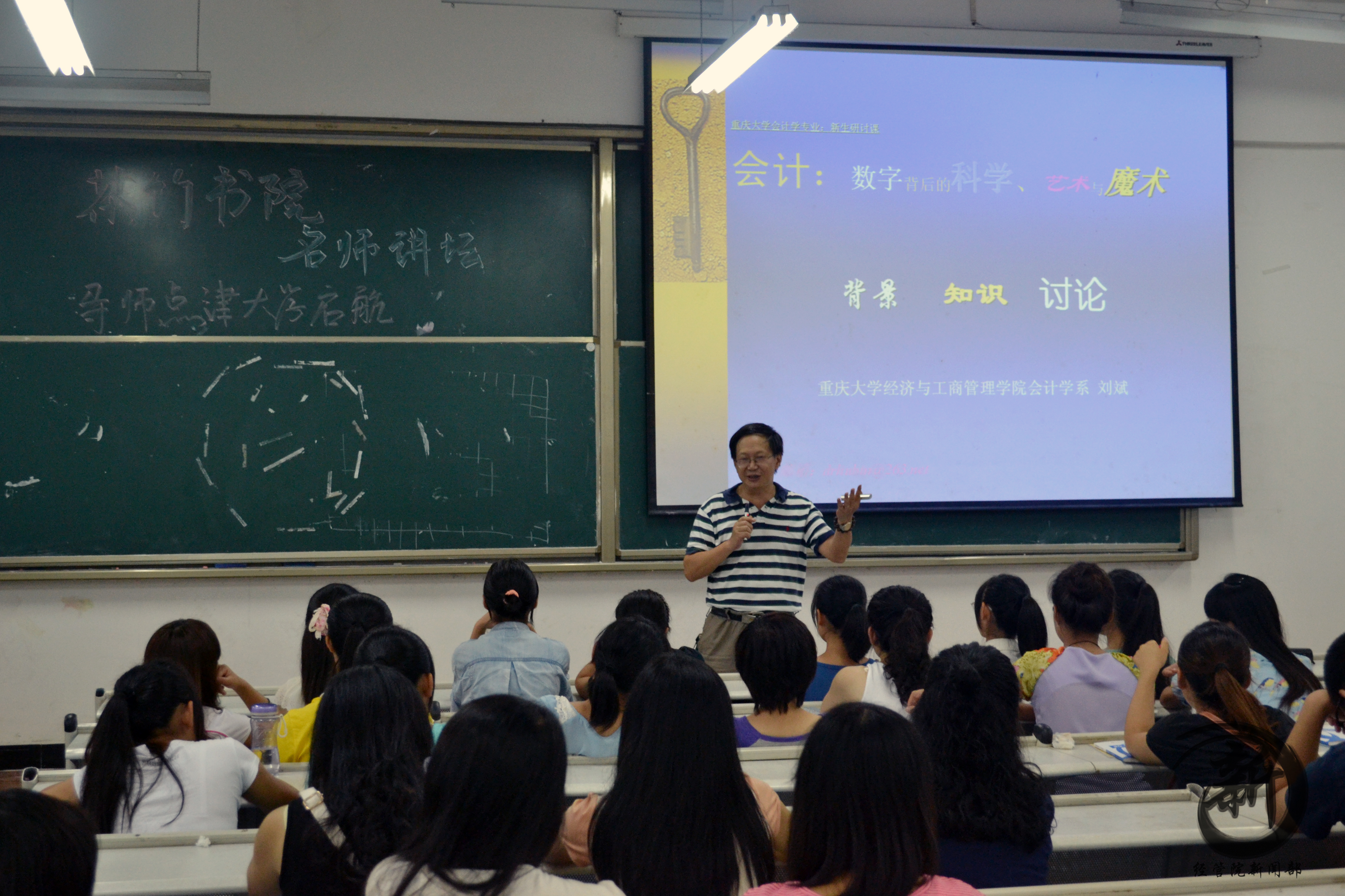 刘斌,重庆大学经济与工商管理学院会计学系主任,管理学博士,会计学教授,博士研究生导师,厦门大学会计发展研究中心博士后,中国会计学会会员,中国注册会计师协会非执业会员,重庆市会计学会常务理事,重庆市审计学会副会长,重庆市司法鉴定委员会司法会计鉴定专家,重庆市企业信息化专家组成员,重庆市科技咨询协会管理咨询专家。刘教授受重庆大学城市科技学院经济管理学院的邀请,为13级会计学专业新同学带来了一场精彩的讲座。