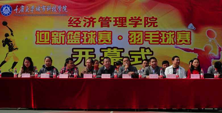 2012年10月25日12点30分,经济管理学院"迎新"杯篮球赛、羽毛球赛开幕式在第三教学楼前的篮球场正式拉开了帷幕。出席本次开幕式的嘉宾有重庆大学城市科技学院常务副院长王银锋,党委副书记、副院长章锋云,学生处副处长陈宣君,经济管理学院党总支书记赵昌龙,院长曹跃群、副院长张子林以及人文学院团总支书记刘茜和经管院的全体辅导员。