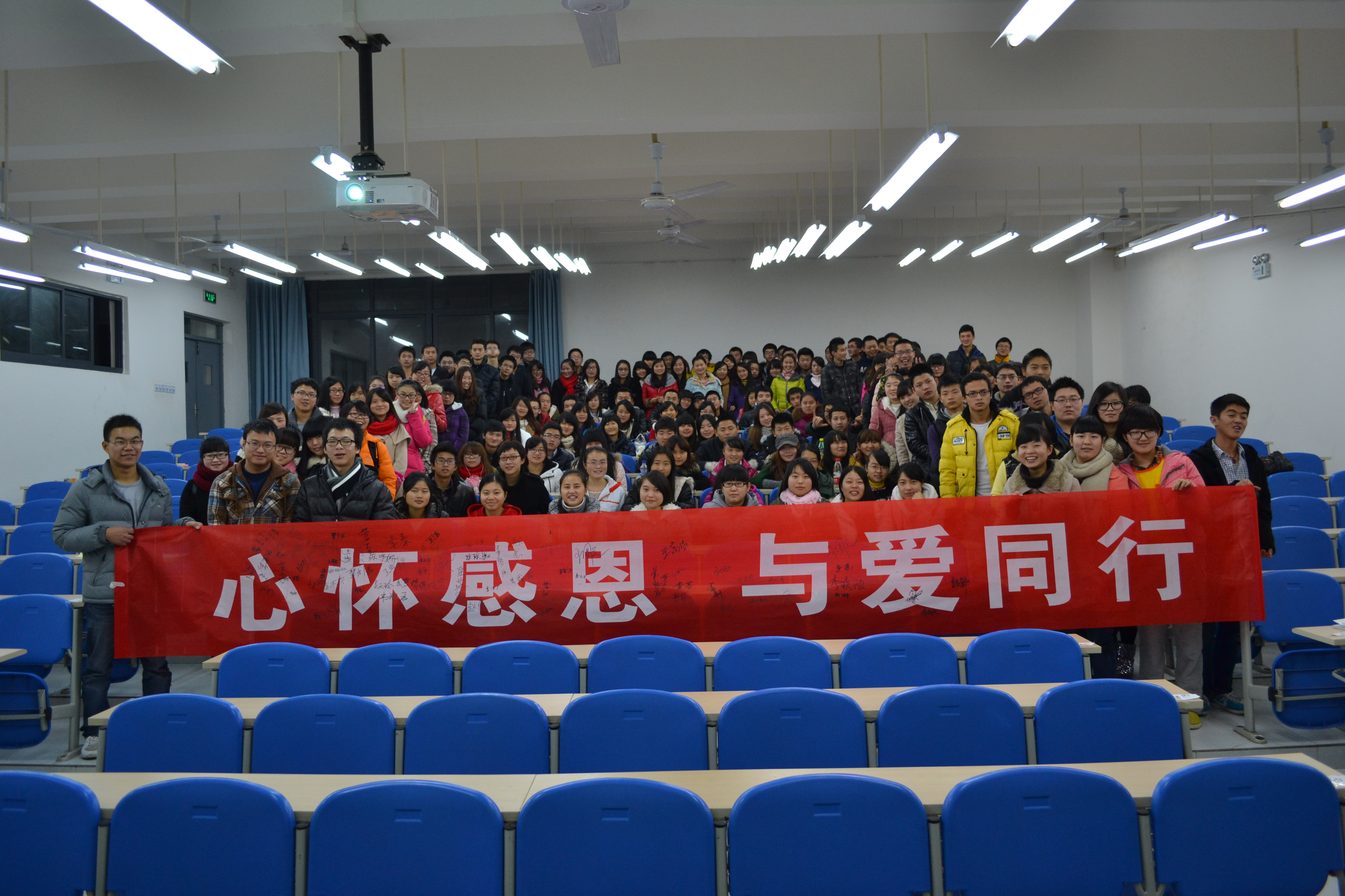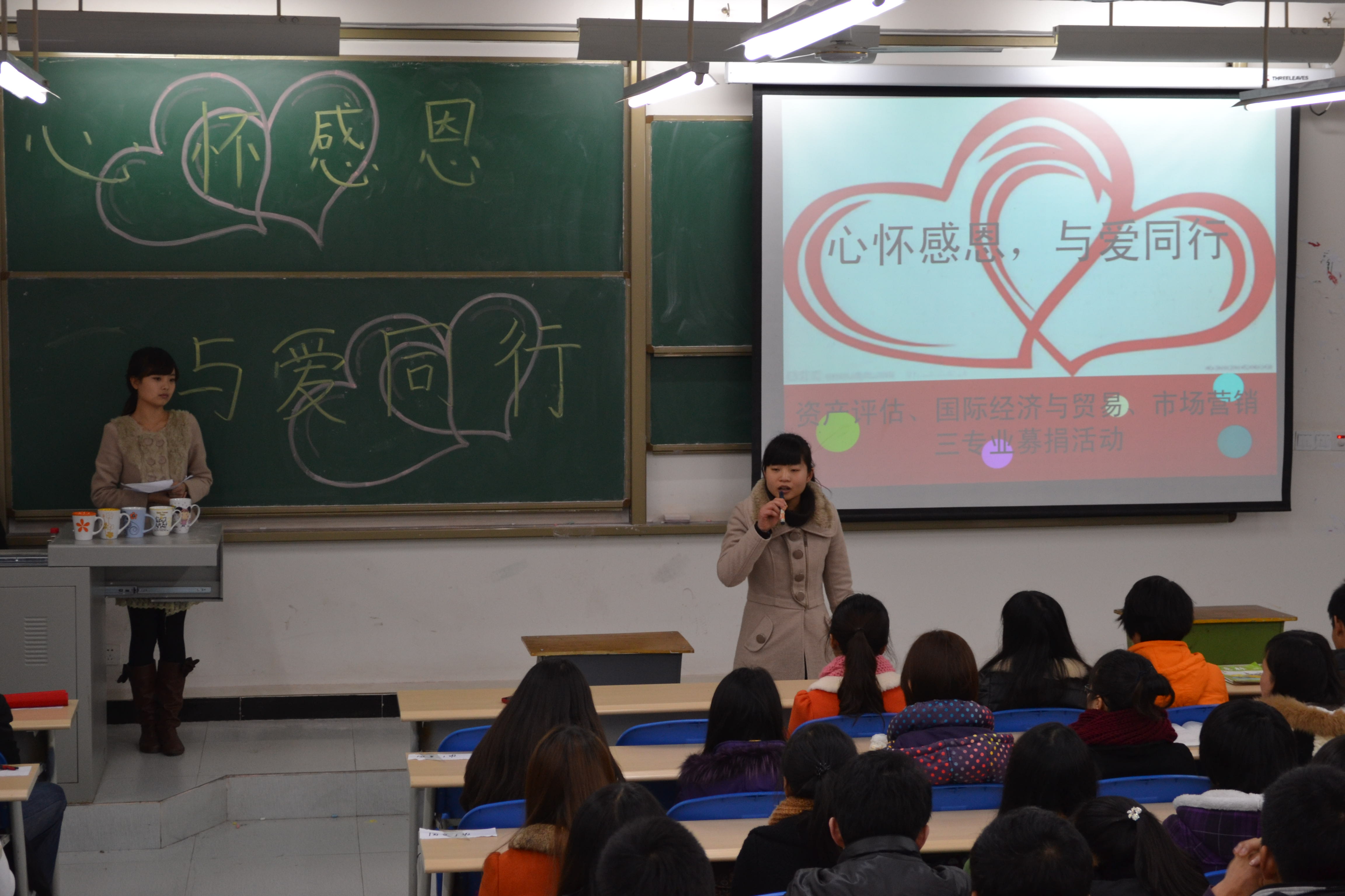 12月25日晚,经济管理学院2012级国际经济与贸易,资产评估,市场营销三专业联合举办的“心怀感恩,与爱同行”—支援藏区募捐活动在新教202隆重举行。