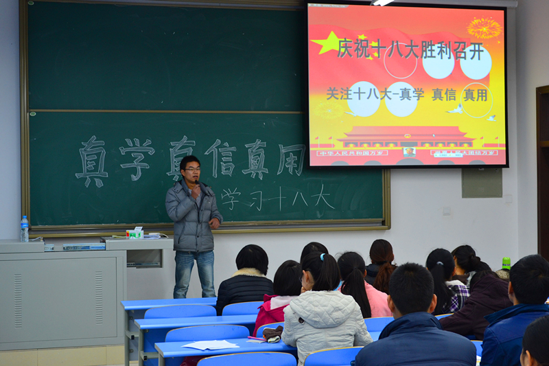 11月29日,经管学院2012级国际经济与贸易1-3班80余名同学在6教102召开了“真学、真信、真用--学习十八大”的主题班会。