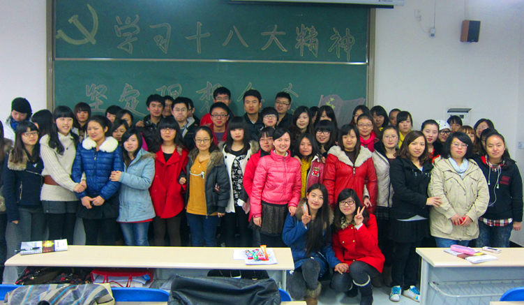 2012年12月4日下午4点,2010级会计学7、8班同学围绕 “十八大”会议精神,结合实际,在新教204开展了 “学习十八大精神,坚定理想信念”的主题班会。两班共61名同学参加。