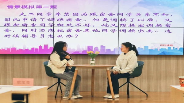 本次大赛包括主题宣讲和情景模拟及评委提问两个环节。主题宣讲环节,辅导员们紧密联系工作实例,全面展示了辅导员的专业素养、逻辑思维及语言表达能力。情景模拟环节,以情景再现的方式与学生展开谈心谈话,主题涉及思想、学习、生活、交友等方面,各参赛老师针对所选案例进行理性分析并现场对学生进行沟通开导。随后,根据现场学生表现及辅导员相关谈话内容,各评委对参赛老师进行点评并提出相关建议。