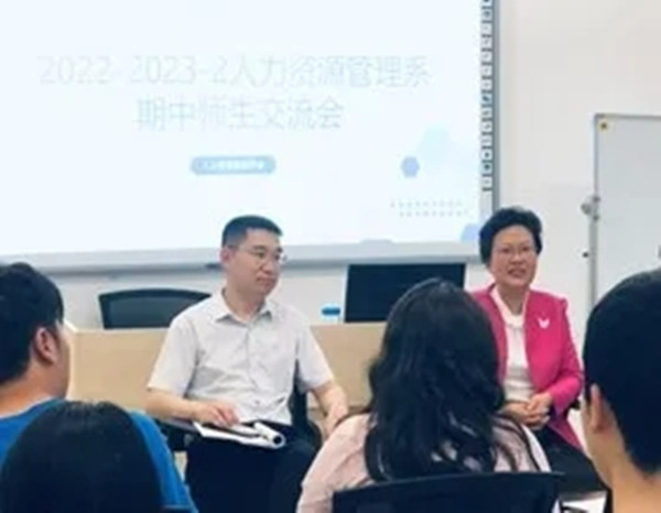 本次交流会共邀请九名人力资源管理系教研室老师,为人力资源管理系各年级的学生答疑解惑,同时了解学生现阶段的学习情况并听取同学们的诉求和建议。在交流会现场,老师与同学们进行了亲切讨论。
