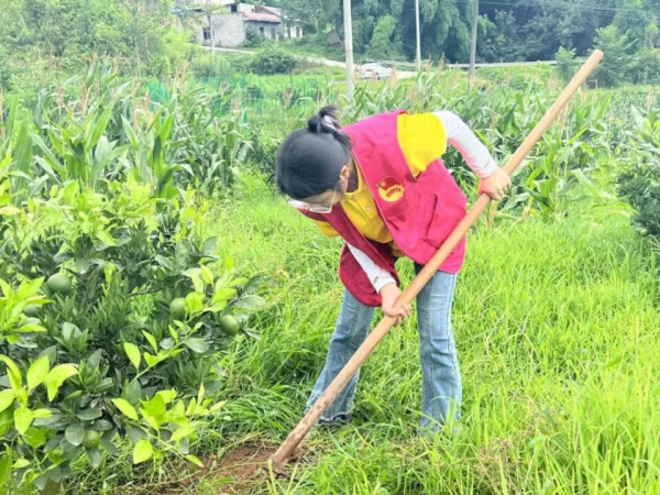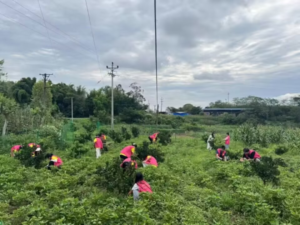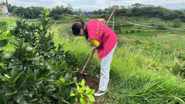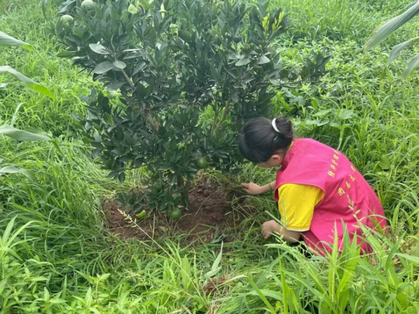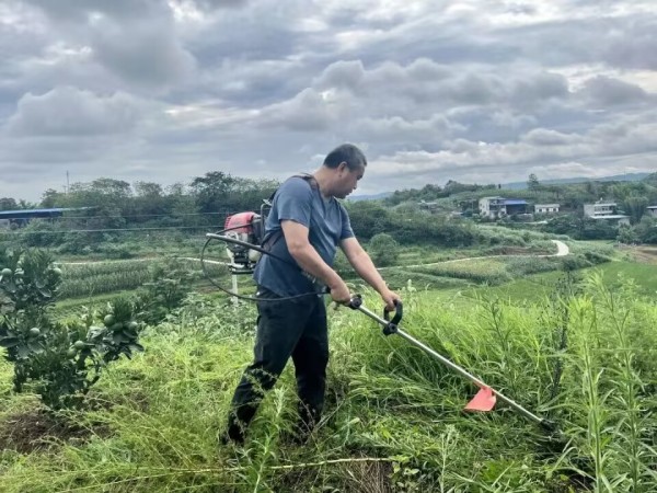 正值雨后,杂草丛生,为了不让杂草与柑橘树争夺养分,成员们纷纷拿上工具,在柑橘园负责人的带领下为柑橘树除草。期间,柑橘园负责人为成员们展示了一种割草工具,齿轮飞转,所过之处,寸草不留。