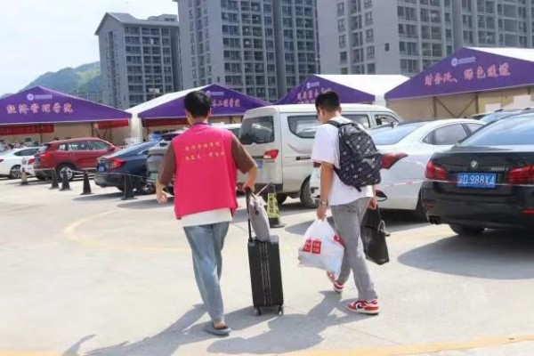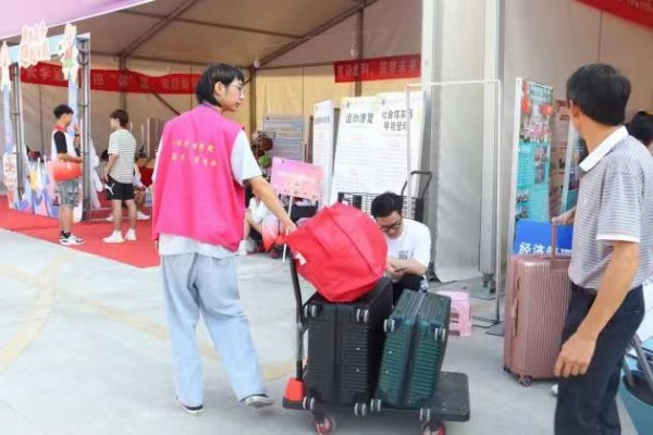 贴心准备,以心迎新。迎新志愿者身穿“红马甲”,活跃在新生的视野中,他们仔细清点所需材料,耐心解答新生疑惑,认真负责的引导着新生完成报道入学流程,为新生搬运着行李,为入校的新生提供最周到细致的服务,让初来乍到的新生们感受到学校的温暖关怀。
