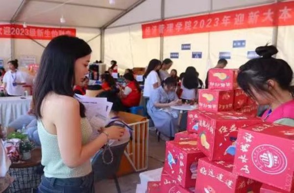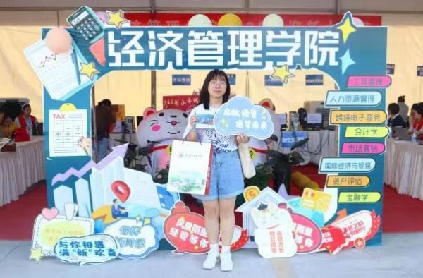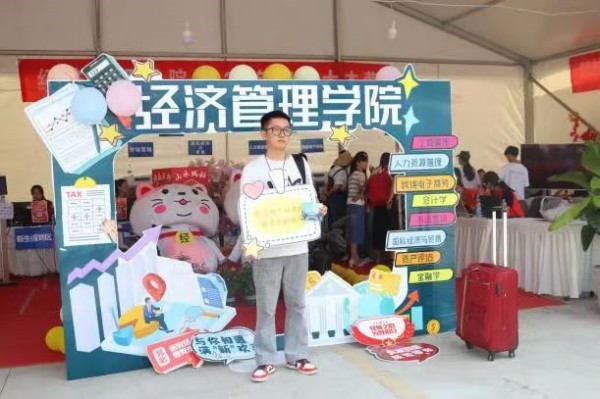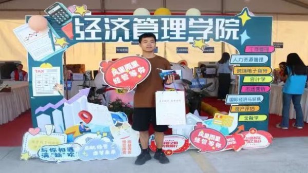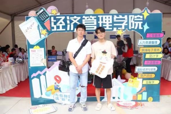 在经管大本营前,学院设置了新生打卡点,新生们留下合影,记录与大学生活的第一帧;手绘第一张入学明信片,书写下对大学的向往与期盼。