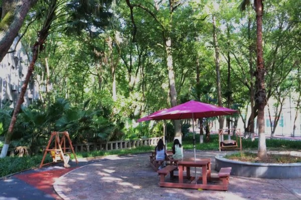转入去往主教学楼的那条小路,让我们坐在秋千上小憩,聆听风的轻语,微风吹过树林,树叶间晒落了斑驳的阳光,我们在这里散步,我们在这里乘凉。在荡秋千的瞬间,时光仿佛静止,只剩下内心的平静与安宁,三三两两的学子让秋千充满了温暖,洋溢着青春活泼,让校园充满欢声笑语。