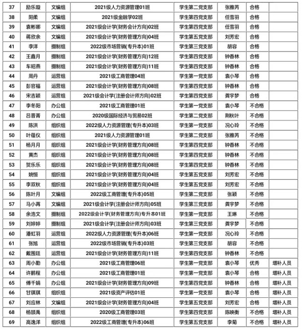 为全面贯彻落实新时代党的建设总要求和新时代党的组织路线,进一步加强入党积极分子教育管理,做好党员发展和教育工作,切实保障学院党建工作持续高效开展。根据《经济管理学院学生党员骨干班暨入党积极分子骨干班管理办法》相关规定,经济管理学院第十一期入党积极分子骨干班成员通过为期一年的学习,于11月5日完成集中培训。经过理论学习和实践活动的综合考察,缪志妙、苏金莲等34名学员考察成绩合格,予以结业;陈雯靖、吴见等17名学员表现优异,被评为“优秀学员”;李冬阳、吕晋菁等18名学员成绩不合格,不予结业。