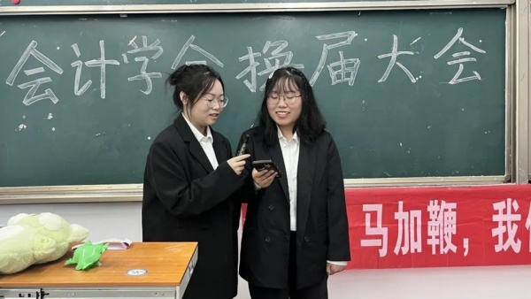 踔厉奋发,勇毅前行。首先,王英超会长对会计学会过去一年来辛苦付出的全体同学和指导老师表示衷心的感谢,也对新一届的骨干寄予厚望。随后,主持人宣布换届决定,王英超会长为新会长们佩戴工作牌,这是身份的更替,更是使命的交接。紧接着,郎武林和刘琴两位同学为大家带来了歌曲《大梦想家》,婉转动听的歌声展示了会计学会的朝气蓬勃的精神面貌,深深感动了在场的同学们。最后,主持人和现场的同学们玩起了互动小游戏,同学们积极参与游戏,乐在其中,大家都融入了会计学会这个大家庭,大会现场一片欢声笑语,大会也在此落下帷幕。