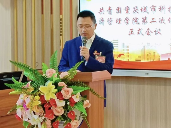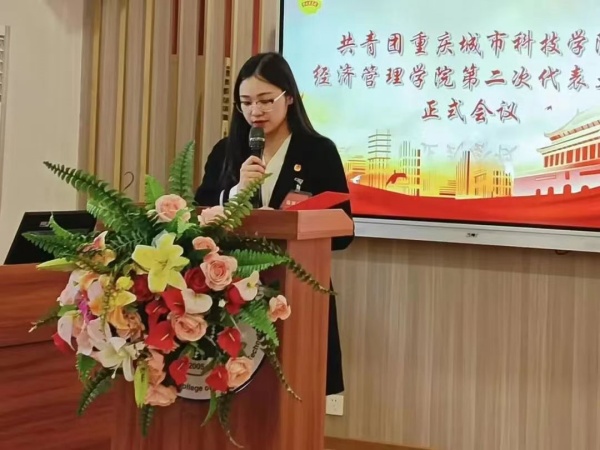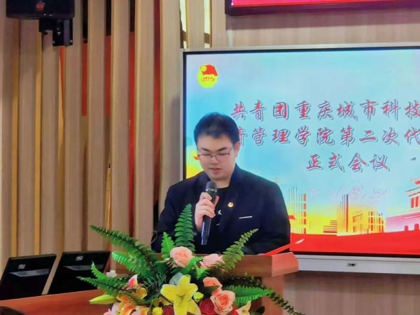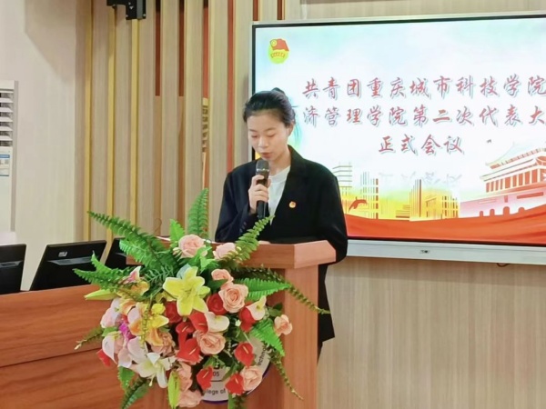 刘杭同学代表共青团重庆城市科技学院经济管理学院第一届总支部委员会作了题为《高举团旗跟党走 青春奋进勇担当》的工作报告,报告分为2个部分:砥砺奋进、务实笃行的青春历程和新时代新时期下的青春使命,全面回顾了五年来经济管理学院团总支取得的工作成绩,明确了今后五年经济管理学院共青团工作的总体要求和主要任务。