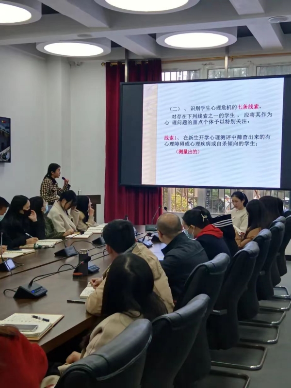 培训伊始,周文老师强调了大学生的心理健康对学生学习生活、成长成才的重要性,辅导员要尤其重视大学生的心理健康工作。紧接着,周文老师分别从“七种方法、七条线索、八个表现”重点阐述了学生心理危机的发现与识别。其中七种方法分别是:辅导员观察、心理测量、心理委员、心理咨询师、家校沟通、学生求助、重点人群排查;七条线索分别是:新生普测、重大应急事件、学习成绩差就业困难、贫困生、网络成瘾、心理疾病、发现自杀信号;八个异常表现分别是:学习困难、情绪异常、意志不健全、人格不完整、自我意识不正确、人际关系不和谐、适应能力差,心理行为不符合年龄特征。如果出现以上的问题和线索,表明学生存在不同程度的问题,辅导员老师要及时的跟踪与干预。最后,周文老师讲到,面对已经发现的心理危机学生要及时上报,及时干预,持续跟踪,可联动学校心理中心、学院兼职心理老师、学生家长、班级心理委员形成教育合力,最大限度保障学生的身心安全。