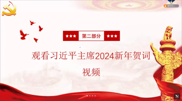 会议伊始,董雪雪同志带领支部全体党员同志共同观看习近平主席2024新年贺词。视频中习近平主席强调要继续支持香港、澳门发挥自身优势,在更好融入国家发展大局中保持长期繁荣稳定。祖国统一是历史必然,两岸同胞要携手同心,共享民族复兴的伟大荣光。当前,世界上还有一些地方处在战火硝烟之中,中国人民深知和平的珍贵,愿同国际社会一道,以人类前途为怀、以人民福祉为念,推动构建人类命运共同体,建设更加美好的世界。