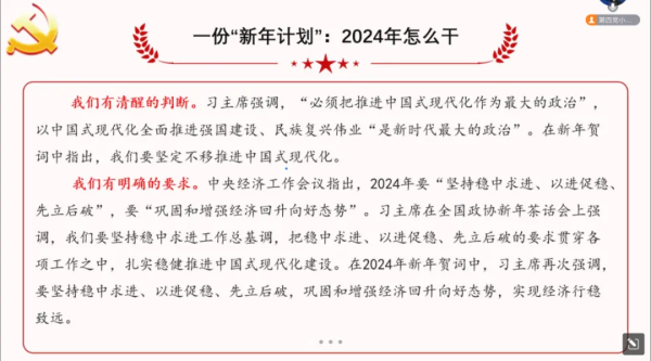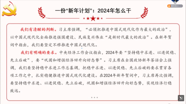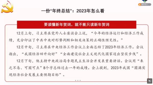 紧接着,董雪雪同志以解读习近平主席2024新年贺词为切入点,带领支部全体党员同志深入学习2023年的年终总结和2024年的新年计划。她谈到,过去这一年,是全面贯彻党的二十大精神的开局之年,是三年新冠疫情防控转段后经济恢复发展的一年。面对国际政治经济环境不利因素增多、国内周期性和结构性矛盾叠加的错综复杂形势,以习近平同志为核心的党中央团结带领全党全国各族人民顶住外部压力、克服内部困难,坚持稳中求进工作总基调,全面深化改革开放,推动经济恢复发展,圆满实现经济社会发展主要预期目标,取得了来之不易、可圈可点的成绩。