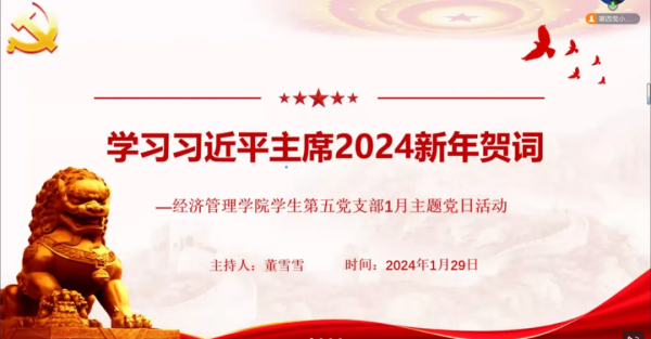 为深入学习习近平总书记二〇二四年新年贺词的重要内涵,引导支部党员同志踔厉奋发、勇毅前行,1月29日中午,经济管理学院学生第五党支部于线上(腾讯会议)组织开展以“学习习近平主席2024新年贺词”为主题的党日活动。支部书记刘芳宏、副书记蔡萍及支部全体党员同志参加。本次会议由董雪雪同志主持。